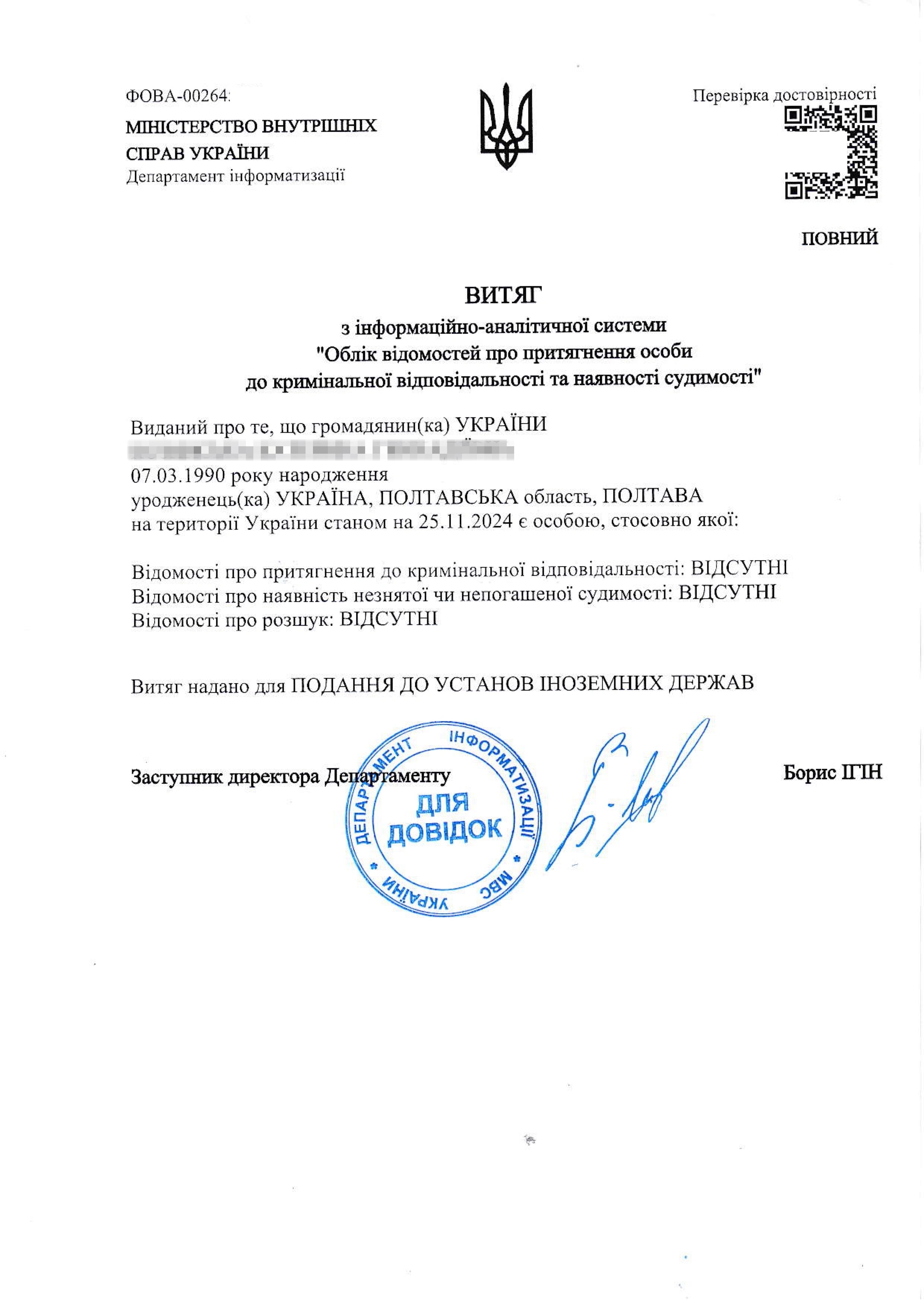 ТЕРМІНОВА Довідка (витяг) про наявність судимості + АПОСТИЛЬ